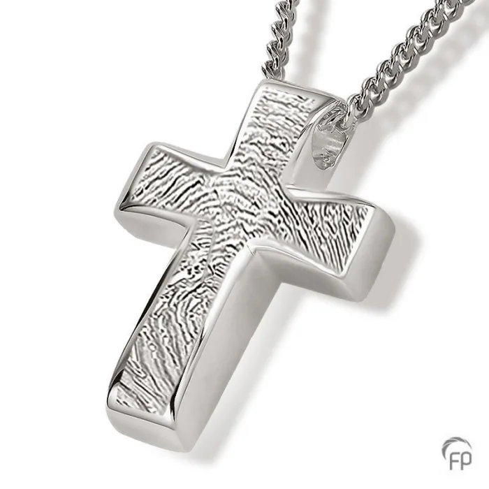 Cross Fingerprint Cremation Pendant with brushed finish and ash container for a symbolic amount of ashes. Necklace not included.