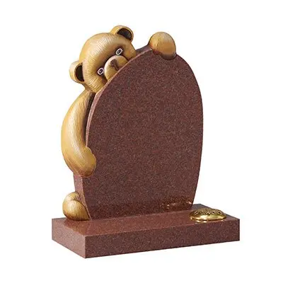 This red granite children’s headstone features a teddy, cuddling the inscription area. This detailed design is a beautiful memorial.