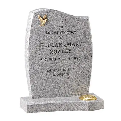 The Warwick grey granite headstone. This beautiful design features a unique bronze bird ornament and provides a detailed memorial for your loved one.