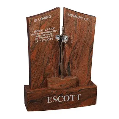 This specialist double grave memorial in Indian Juparana granite features a winged headstone. This design also includes a beautiful bronze flower sculpture, for a unique double memorial.